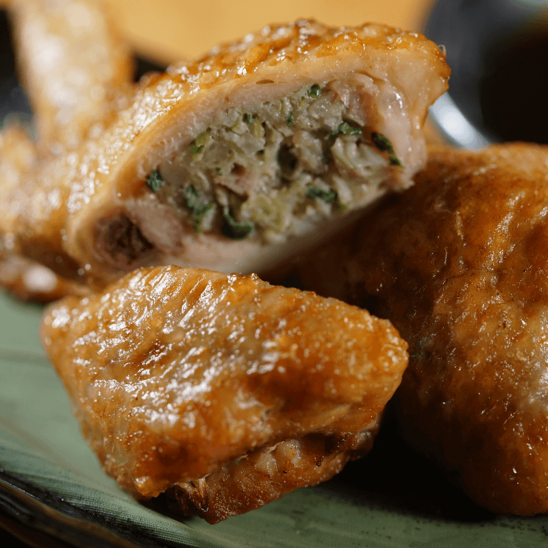 將去骨雞翅填入蔬菜肉餡,油炸後外脆內香!煎烤氣炸皆可,聚會上桌吸睛。圖/風來坊串串居酒屋提供。