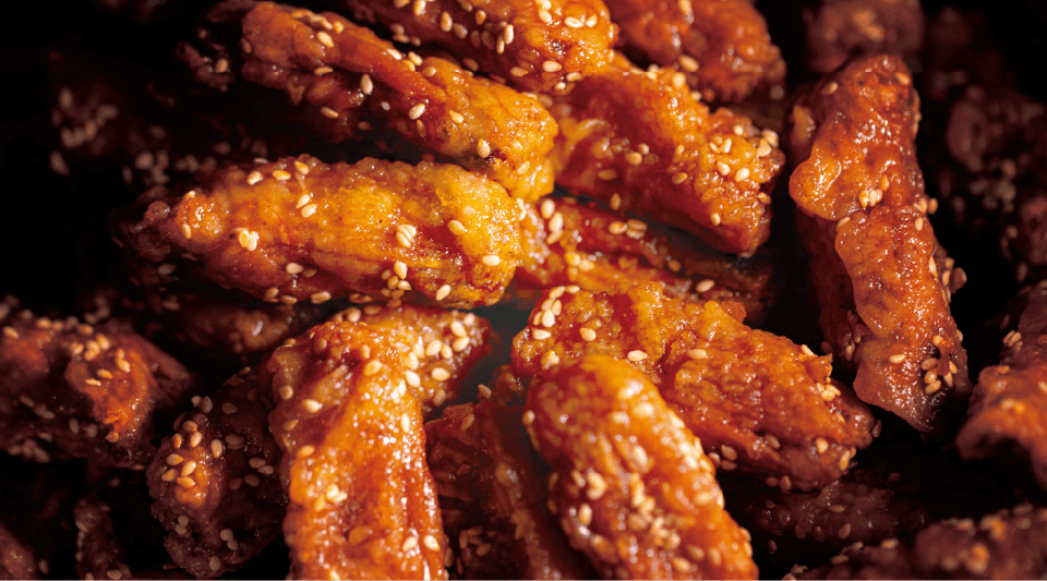 嚴選雞翅經二次油炸,外酥內嫩的金黃色,淋上風來坊秘傳熟成醬料,撒上芝麻、胡椒增香。品嘗時用手豪爽抓著吃,與啤酒是一大絕配。